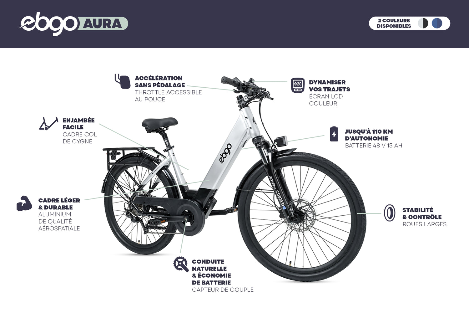 Dans des conditions idéales, l’AURA peut offrir jusqu’à 110 km d’autonomie sur une seule charge. L’autonomie réelle peut varier selon le niveau d’assistance, le terrain, le poids transporté, la température et votre style de conduite.
